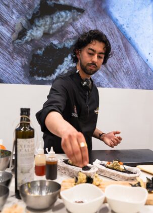 Por último, el chef Arpit Aneja, de Restaurante Wassy, ha preparado tres platos en la cocina de Dekton by Cosentino del stand almeriense: un tartar de tomate raf con sakubushi; un taco con ensaladilla rusa con langostino y un panipuri. Aneja, de origen indio, combina en su cocina los sabores de sus raíces con técnicas aprendidas con grandes referentes de la gastronomía española. Su propuesta fusiona productos del Valle del Almanzora y del Mediterráneo con matices de Oriente.